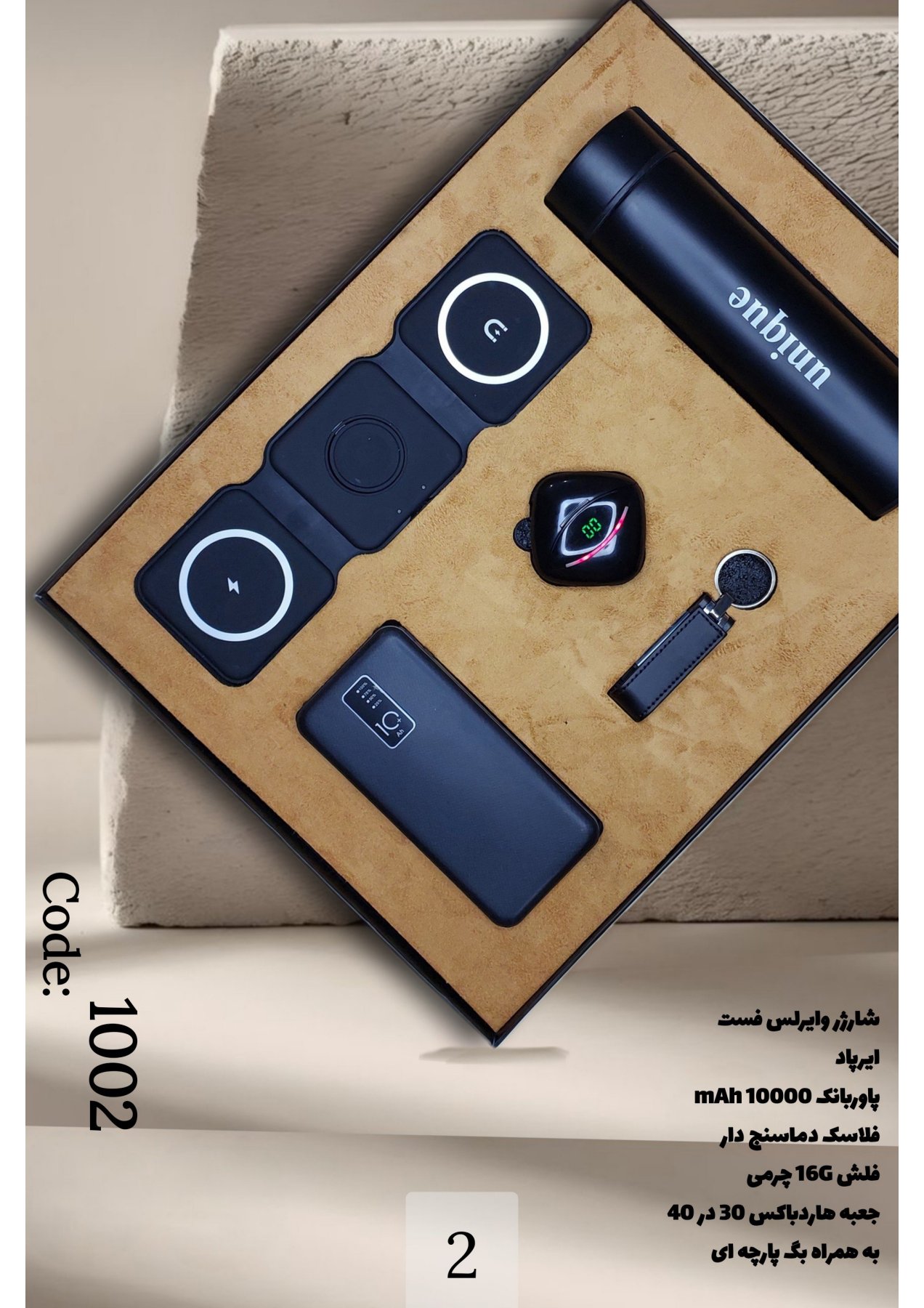 شارژر وایرلس فست _ ایر پاد _ پاور بانکmAh 10000_ فلاسک دماسنج دار _ فلش 16G چرمی _ جعبه هارد باکس ۳۰ در ۴۰ به همراه بگ پارچه ای
