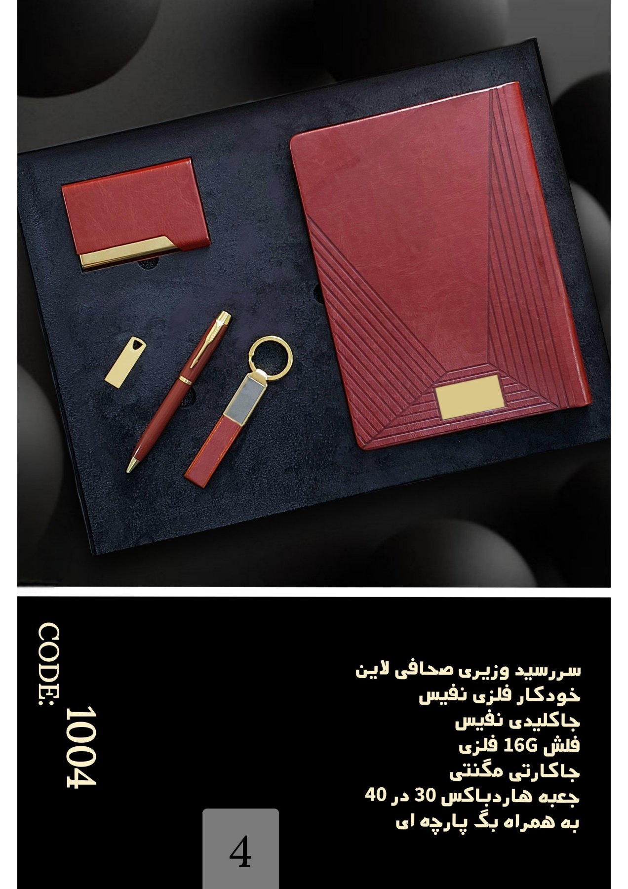 سر رسید وزیری صحافی لاین _ خودکار فلزی نفیس _ جا کلیدی نفیس _ فلش ۱۶ گیگ فلزی _ جاکارتی مگنتی _ جعبه هارد باکس ۳۰ در ۴۰ به همراه بگ پارچه ای